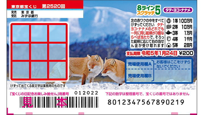 ●「8ラインスクラッチ5 タテ・ヨコ・ナナメ」(4ブロック)は、1等賞金100万円で1日(水)から来年1月25日(火)まで発売中です!