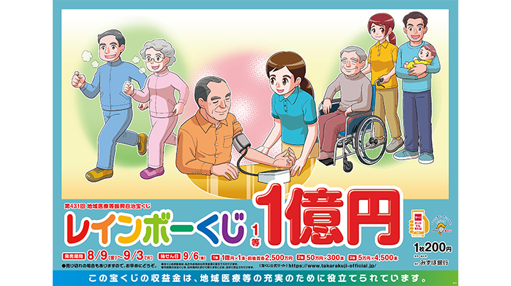 「レインボーくじ」(第431回 地域医療等振興自治宝くじ)は1枚200円で、9日(金)から9月3日(火)まで、全国で発売されます。