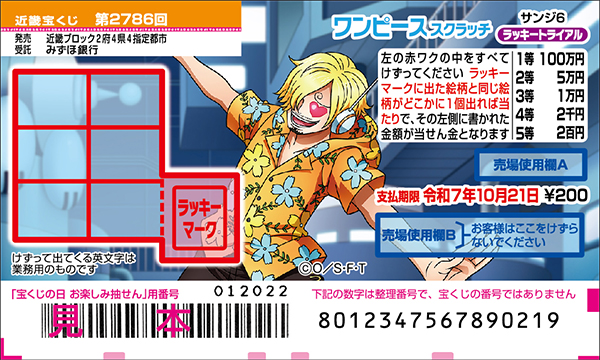 ●「ワンピーススクラッチ シャンクス5 ラッキートライ12」(全国)は、1等賞金1,500万円で23日(水)から11月19日(火)まで発売!