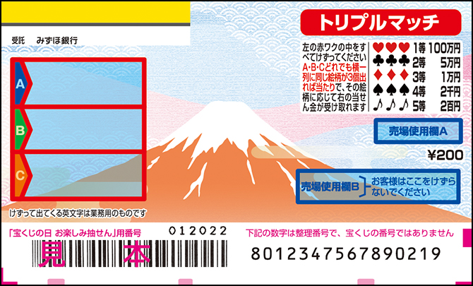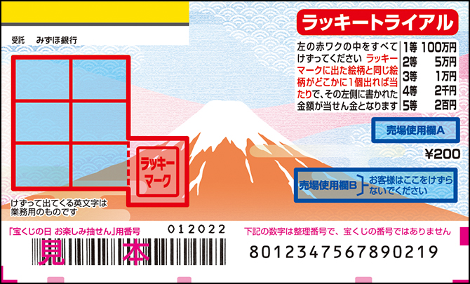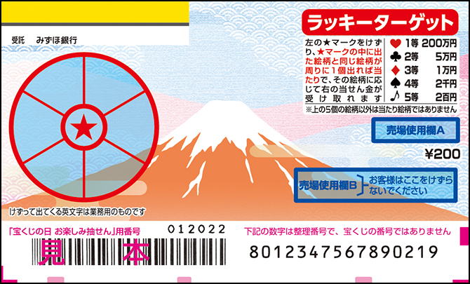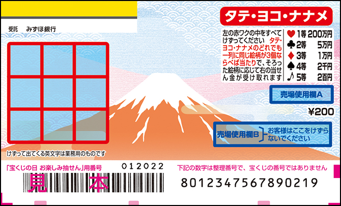 Winnings of up to 100,000 yen (per ticket) can be received immediately at lottery ticket counters nationwide. To claim winnings in excess of 100,000 yen, please visit any convenient Mizuho Bank.
